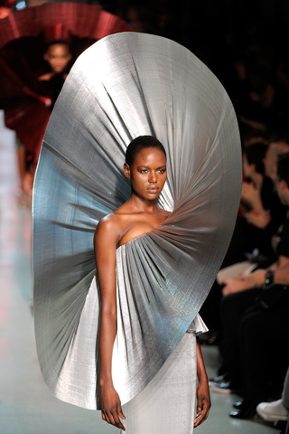 If you know your fashion history--and you should!--Spanish-born Couturier Paco Rabanne was one of the 1960's Couturiers--like Pierre Cardin--who turned the entire fashion world upside down with his chain-link and metal space-age dresses (above photo). Cut to Spring/Summer 2012--Manish Arora sent out a bevy of sexy dresses and skinny pant looks, filled with all the metal to make Rabanne blush.Tight mini dresses with strong shoulder definitions as well as hip-enhancing shapes were abundant. Lots of sequins as well, in studded jackets. Milliner DIVA Philip Treacy created the amazing saucer hats on display and Nicholas Kirkwood designed the crystal-encrusted pumps.